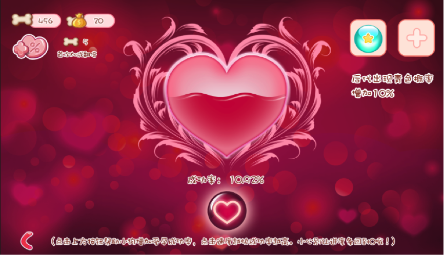 • 疯狂点击图中的爱心按钮,点的越快,怀孕成功率越高。爱心涨满后,根据点击获得的成功率,就会提示你狗狗有没有成功怀孕。